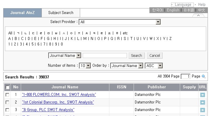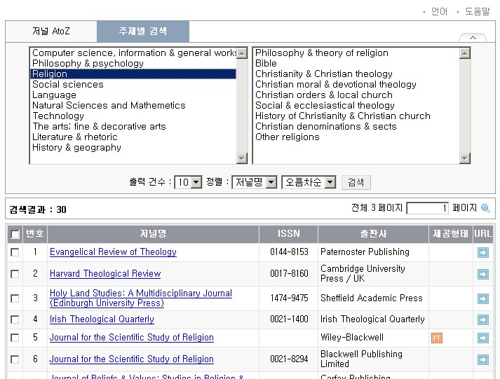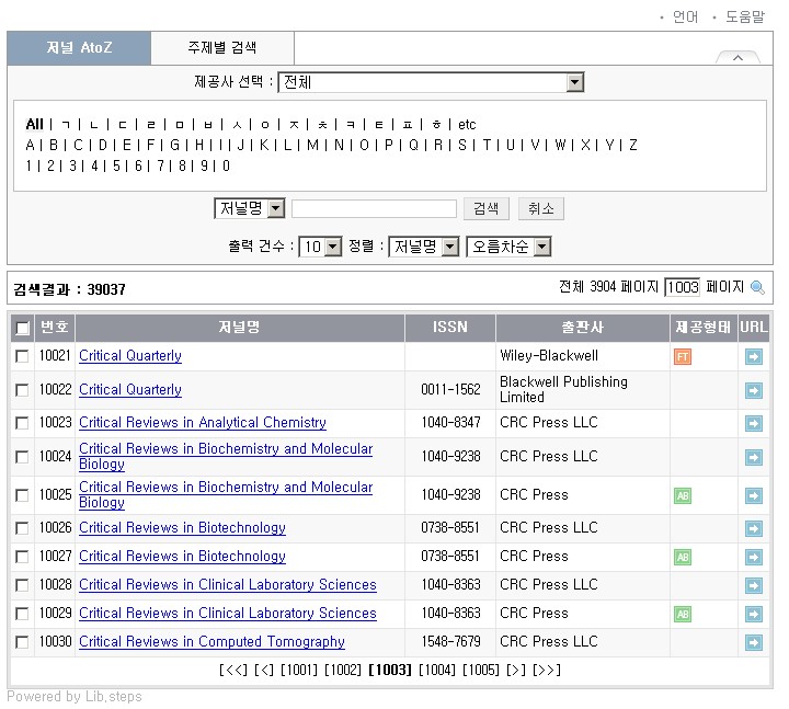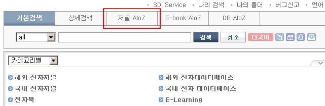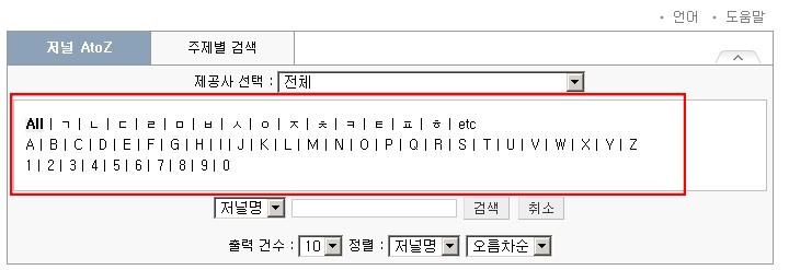 버튼을 클릭하여 Journal AtoZ 검색 페이지로 이동하면