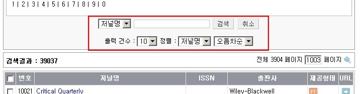 저널명, ISSN, 출판사 중 선택하여 검색이 가능